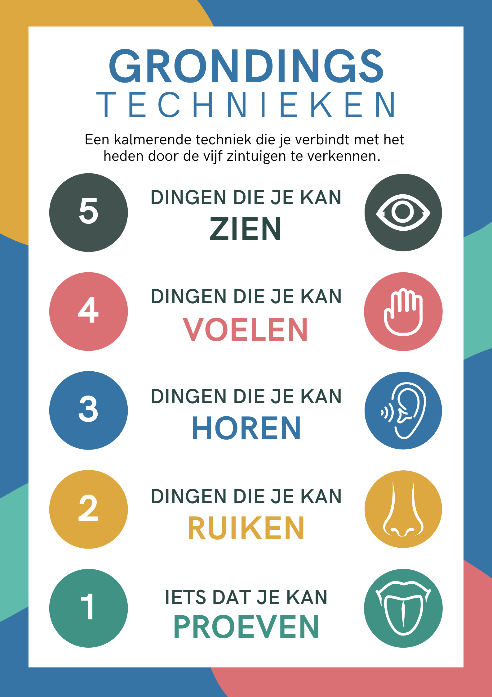 De 5-4-3-2-1 grondingsmethode is een eenvoudige maar effectieve techniek die helpt om je focus te herstellen door gebruik te maken van de vijf zintuigen. Deze methode is bijzonder nuttig in situaties waarin men zich overweldigd of afgeleid voelt. Hieronder volgt een stapsgewijze uitleg van de methode: